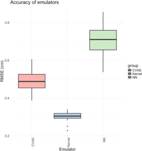 Kami juga melakukan uji peringkat bertanda Wilcoxon berpasangan untuk membandingkan akurasi secara statistik, yang diukur melaluimathematical equationdan RMSE, antara kernel dan CVAE serta kernel dan emulator NN. Uji peringkat bertanda Wilcoxon bersifat nonparametrik dan tidak mengasumsikan kenormalan. Kami memasangkan keduanyamathematical equationdan RMSE untuk masing-masing dari 27 lokasi ketika melakukan uji statistik ini. Nilai p dari semua pengujian sangat kecil, dengan yang terbesar adalahmathematical equation, mendukung alternatif bahwa emulator kernel lebih akurat (dalam hal RMSE yang lebih kecil dan lebih besarmathematical equation) daripada emulator NN atau CVAE.